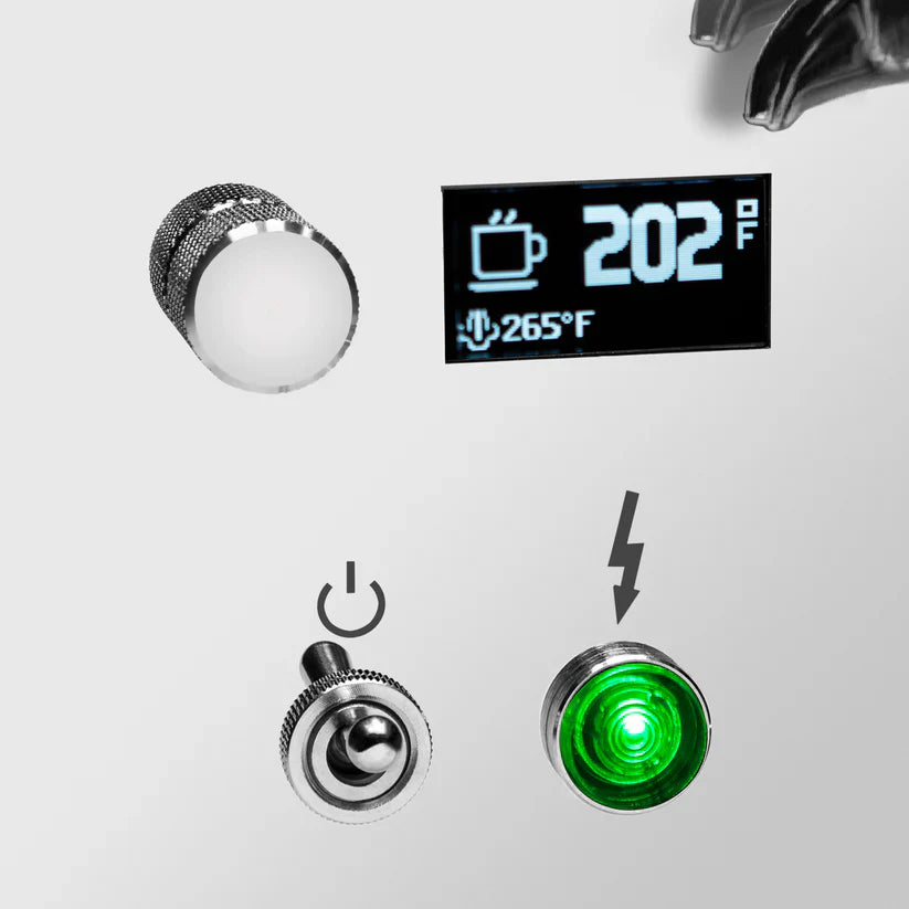 The redesigned OLED PID uses a rotary control knob with crisp knurling for menu navigation. All of the machine’s menus, features, and settings are accessible via this intuitive PID display: individual adjustment of the temperatures in both boilers, an optional display to remind you of group cleaning, an integrated shot timer that activates during extractions, and menus that toggle the automatic pre-infusion and program on/off times.